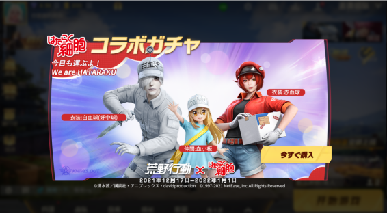 NetEase Gamesが開発・運営する大人気バトルロワイヤルゲーム『荒野行動』にて、2021年12月17日10:00から2022年1月1日10:00の期間中、TVアニメ『はたらく細胞』とのコラボイベントを開催いたします。